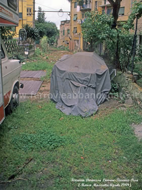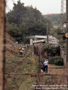 Ex-sedime ancora armato, invaso da capanni ed orti, nei pressi del sottopasso di via Genova a Livorno (M. Mazzotta, 1986)