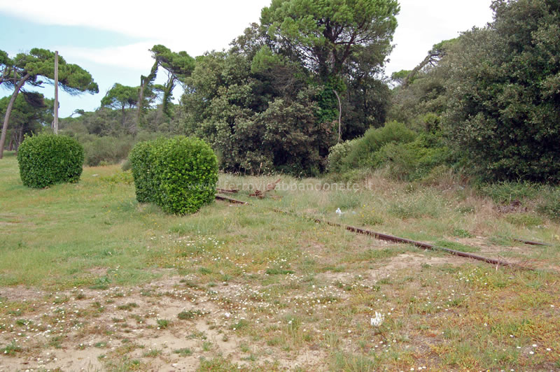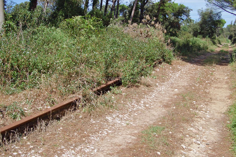 Binario ancora evidente tra la vegetazione tra l'ex-fermata di Marina di Pisa Piazza Gorgona e l'ex-stazione di Marina di Pisa (A. Rossi, 2014)