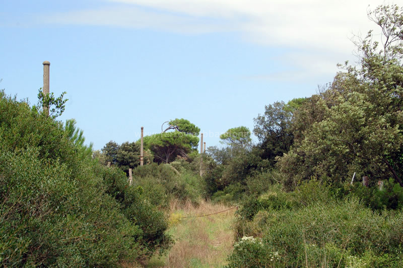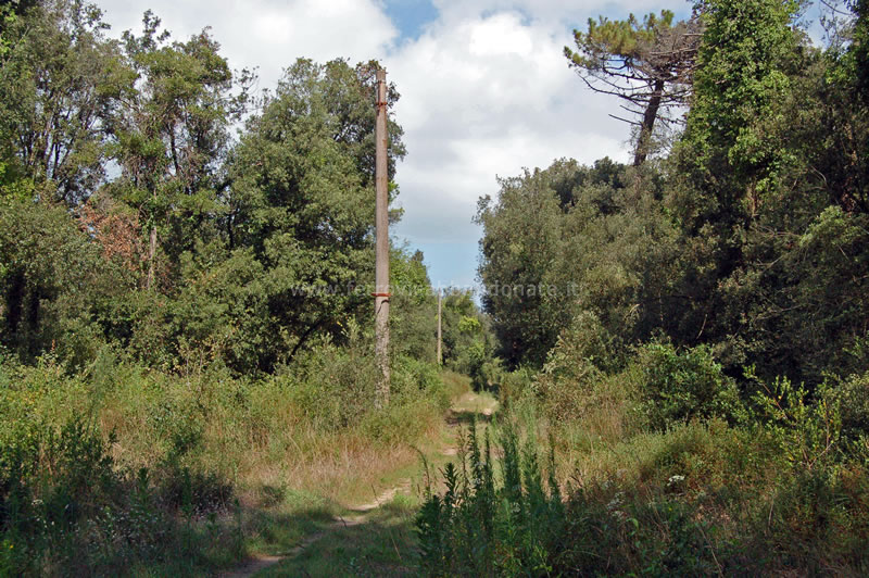 Ex-sedime invaso dalla vegetazione spontanea nei pressi dell'ex-stazione di Marina di Pisa; ancora evidenti i pali della linea aerea (A. Rossi, 2014)