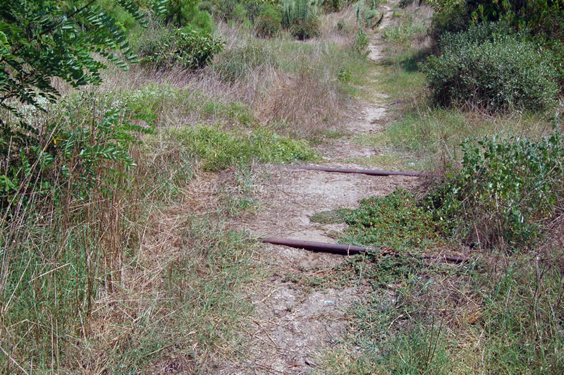 Tratto di binario nascosto dalla vegetazione e dal terreno nei pressi dell'ex-stazione di Tirrenia (A. Rossi, 2014)