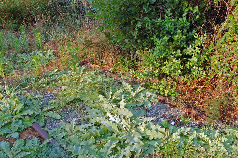 Binario nascosto dalla vegetazione spontanea tra Marina di Pisa e l'ex-fermata Bagni Arcobaleno (A. Rossi, 2014)