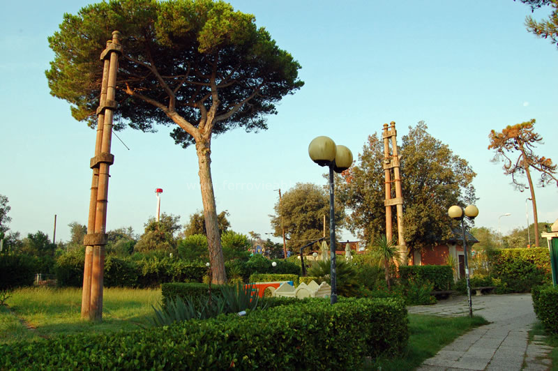 Resti della palificazione nel piazzale della ex-stazione di Tirrenia, trasformato in giardino (A. Rossi, 2014)