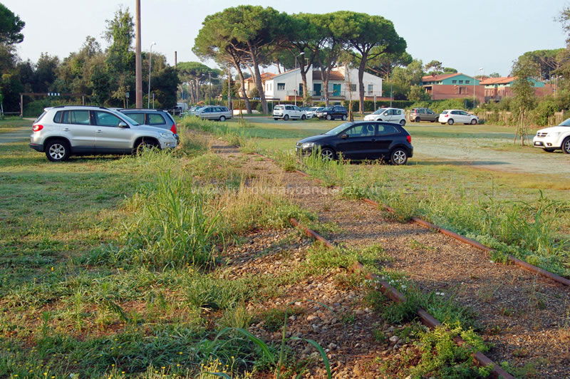 Binario ancora evidente all'interno di un parcheggio nei pressi dell'ex-stazione di Tirrenia (A. Rossi, 2014)