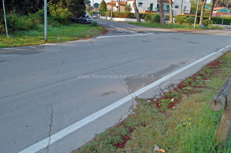 Ex-passaggio a livello nei pressi dell'ex-stazione di Marina di Pisa, con le rotaie che affiorano dall'asfalto (A. Rossi, 2014)
