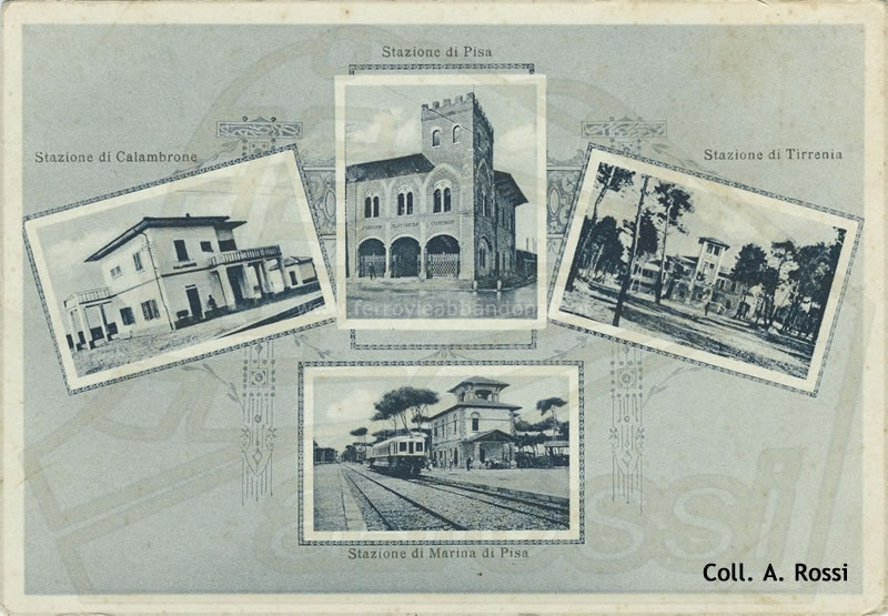 Cartolina d'epoca dedicata alla ferrovia Pisa-Livorno con le foto delle principali stazioni (archivio A. Rossi)