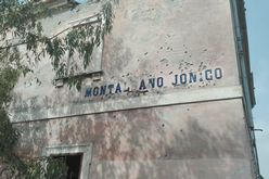 Particolare della facciata laterale del fabbricato viaggiatori di Montalbano Jonico, con il nome della stazione ancora leggibile (A. Stigliani, 2018)