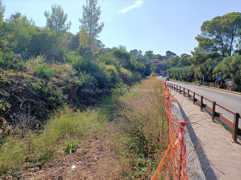 Altra immagine della sede ferroviaria tra la fermata S. Liberata e l'omonima galleria, in parte trasformata in marciapiede (M. Pagnanelli, 2025)