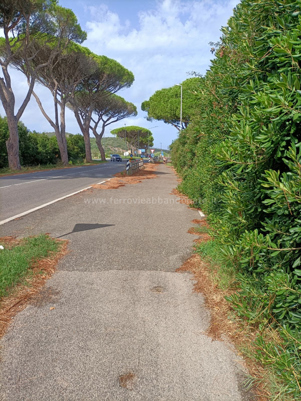 Sede ferroviaria trasformata in un percorso ciclopedonale promiscuo con un servizio di bus navetta tra la fermata S. Liberata e Porto S. Stefano (M. Pagnanelli, 2025)