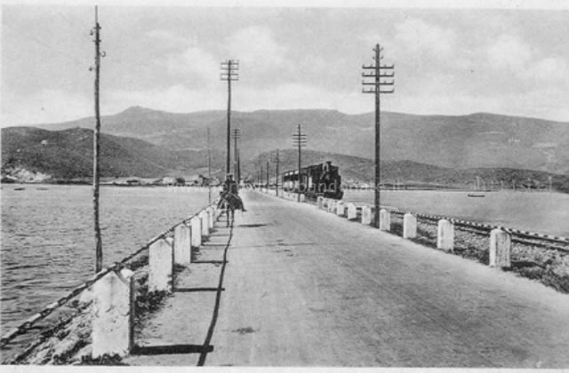 Immagine d'epoca di un treno in corsa lungo la diga di Orbetello, tra le stazioni di Orbetello Città e Terra Rossa (archivio P. A. Marchese)