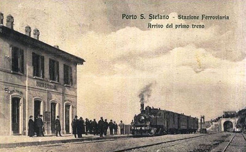 Cartolina d'epoca dell'arrivo del treno inaugurale alla stazione di Porto S. Stefano (archivio P. A. Marchese)