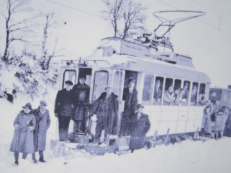 Immagine d'epoca con la sosta di un treno lungo la linea nel periodo invernale (A. Stigliani, R. Pizzacalla, 2017)