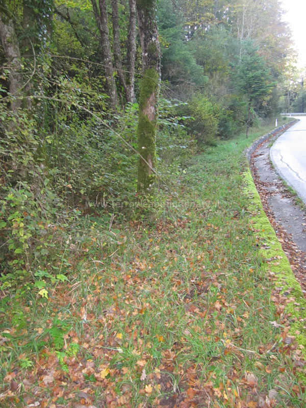 Tracce dell'ex-sedime ferroviario ai margini della carreggiata della S.P., tra Pescolanciano e l'ex-fermata di Colle Meluccio, invaso dalla vegetazione (A. Stigliani, 2013)