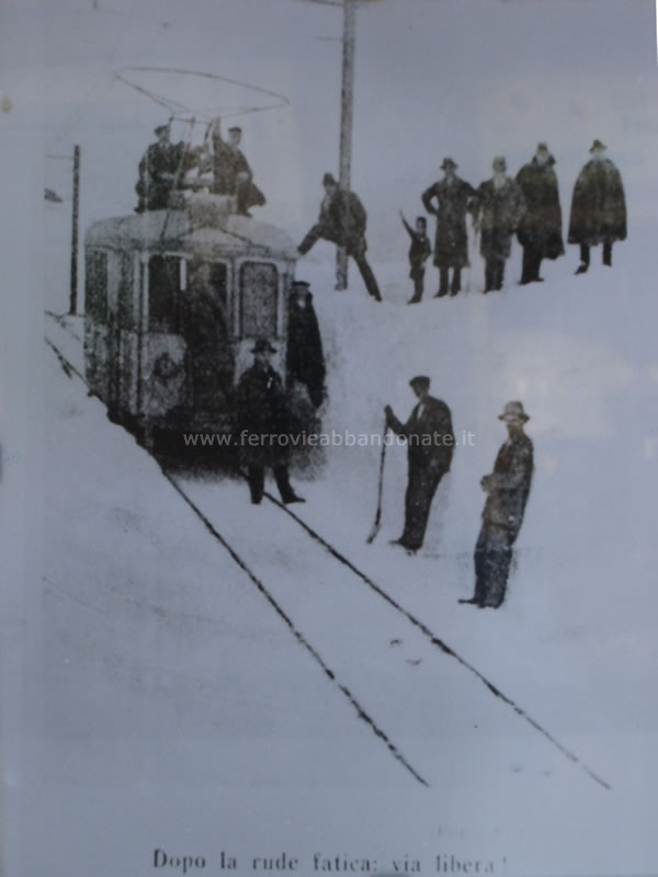 Immagine storica degli anni '30, con operai al lavoro per rimuovere dal binario la neve caduta copiosa (A. Stigliani, 2013)