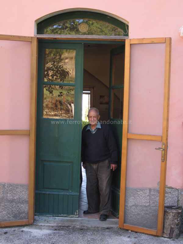 Particolare della porta di accesso, ancora originale, dell'ufficio movimento dell'ex-stazione di Trivento-Bagnoli, con l'attuale proprietario (A. Stigliani, 2013)