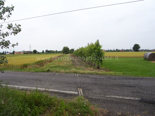 Ex-sedime tra Crevalcore e Decima, con il binario che affiora dal terreno e dall'asfalto (M. Martelli, 2008)