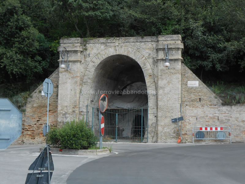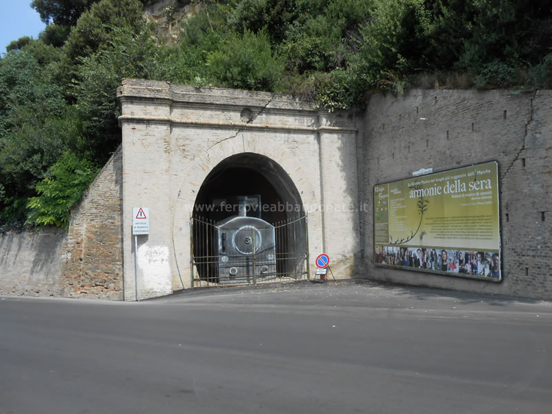 Portale, lato Fermo Città, della galleria Vinci, con all'interno un ricordo della vecchia ferrovia (M. Martelli, 2014)
