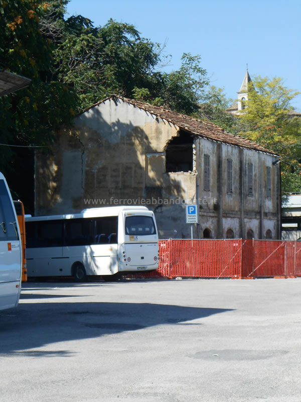 Ex-stazione di Fermo S. Lucia, con il fabbricato viaggiatori abbandonato e il piazzale usato dagli autobus (A. Stigliani, 2015)