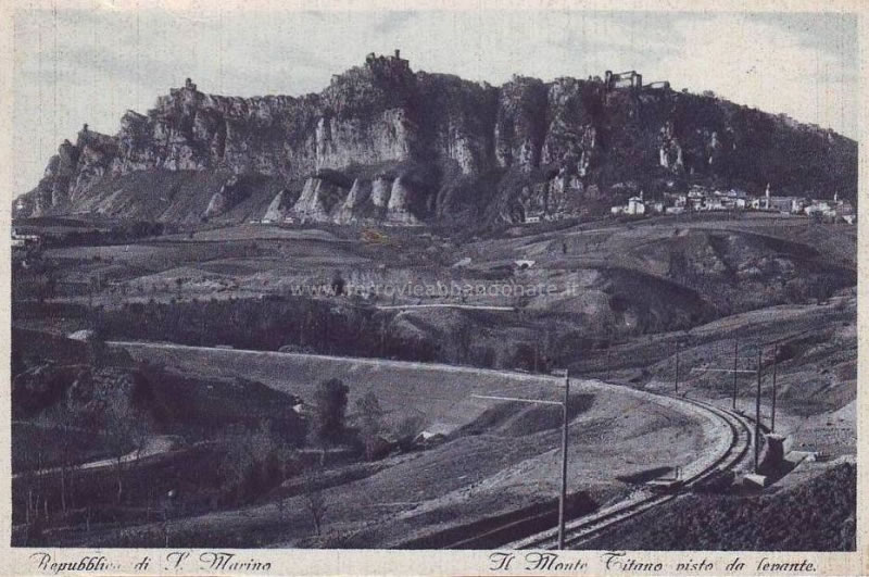 Cartolina d'epoca del tracciato ferroviario ai piedi del monte Titano (archivio P. A. Marchese)