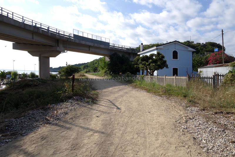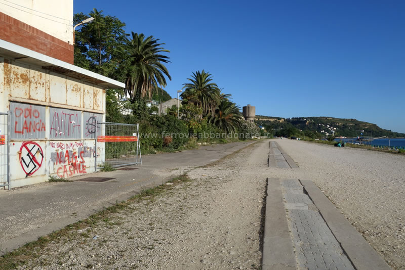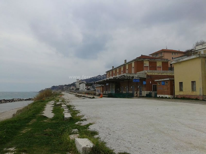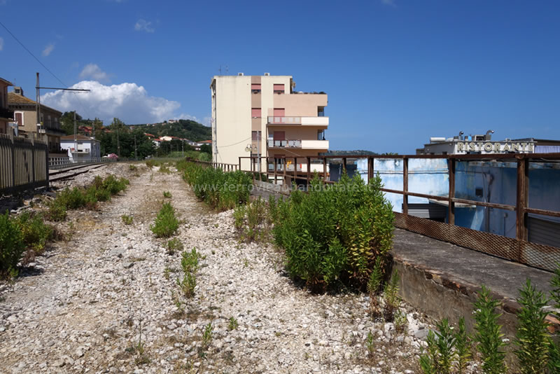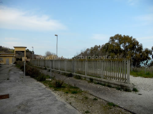 Sede ferroviaria, ormai disarmata nell'abitato di Marina di S. Vito. Sulla sinistra, il binario non più utilizzato della vecchia linee per Lanciano (L. Tiriticco, 2014)