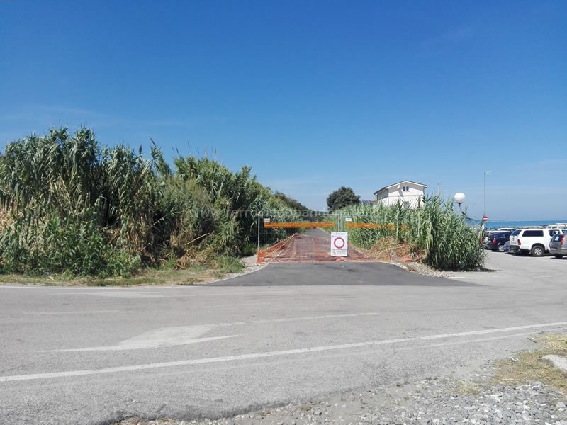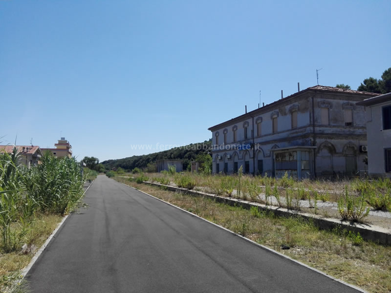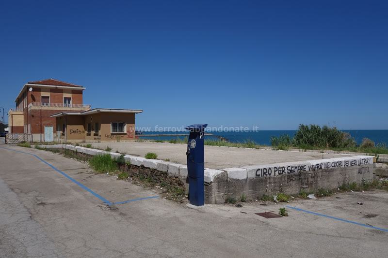 Marciapiedi ancora ben riconoscibili della vecchia stazione di Fossacesia; l'area occupata dai binari è usata come parcheggio per la spiaggia (L. Tiriticco, 2014)