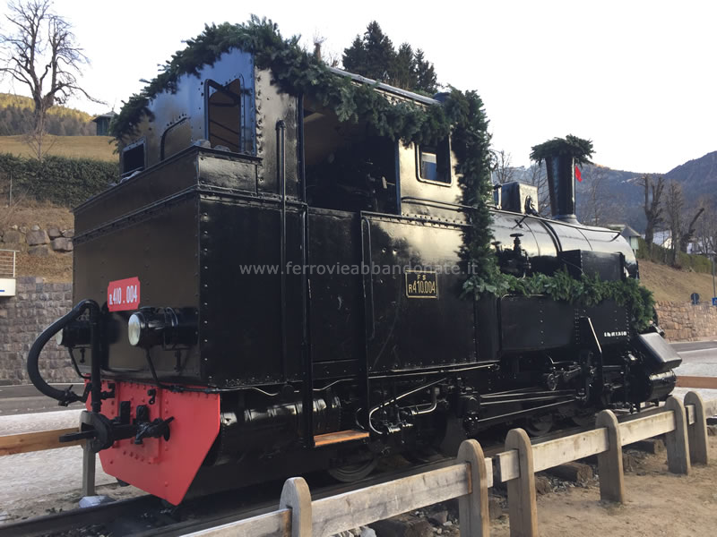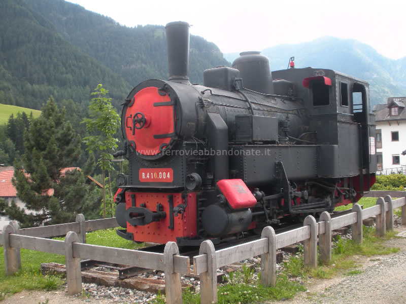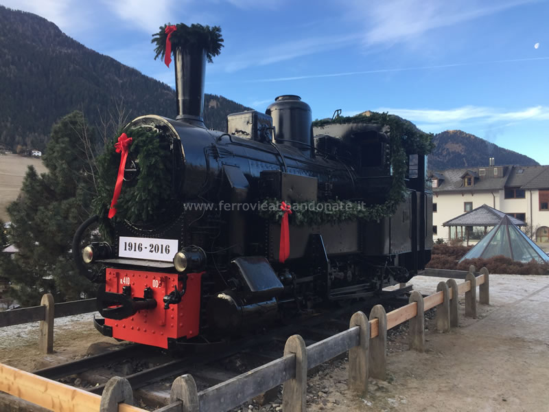 Locomotiva a vapore R410 004, monumentalizzata a Ortisei dove sorgeva l'ex-stazione, oggi scomparsa (R. Rovelli, 2012)