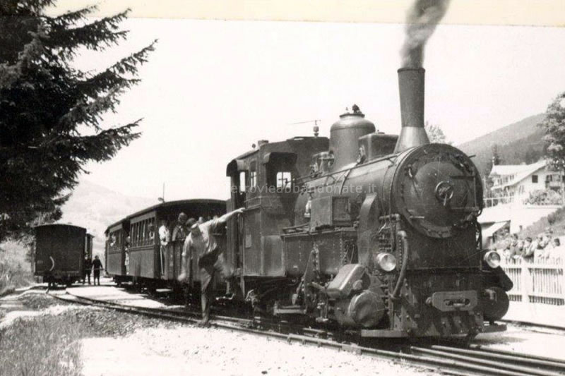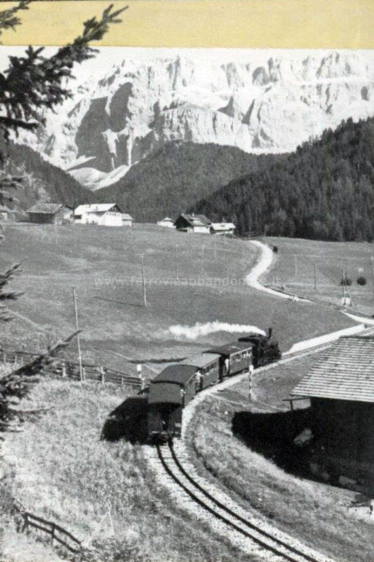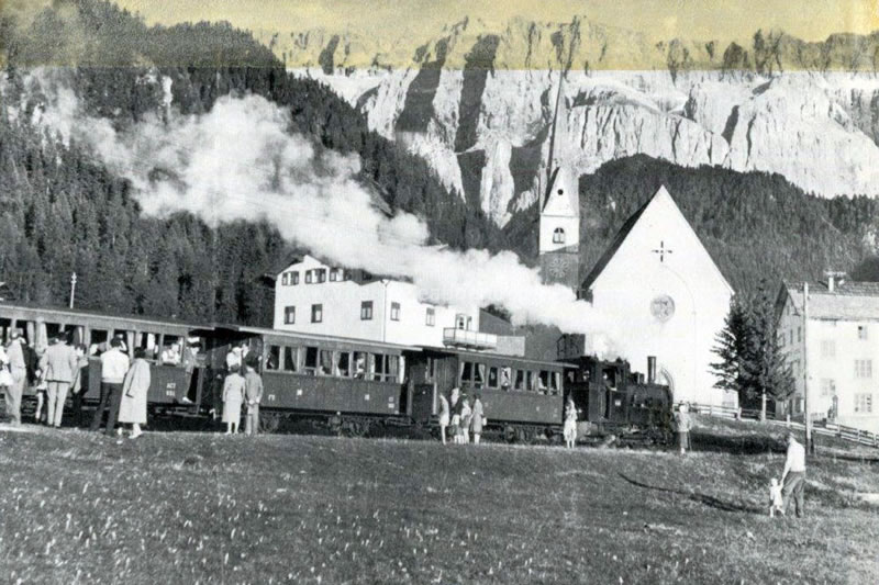 Immagine storica di un treno in corsa tra Ortisei e la fermata di Soplases (archivio J. Klein)