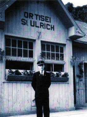 Immagine storica della stazione di Ortisei, con un treno in partenza per Plan nel 1958 (archivio J. Klein)