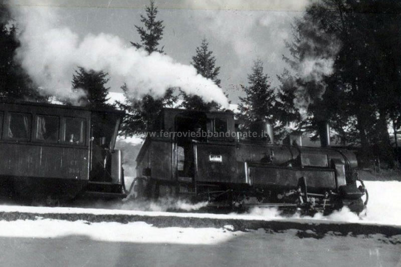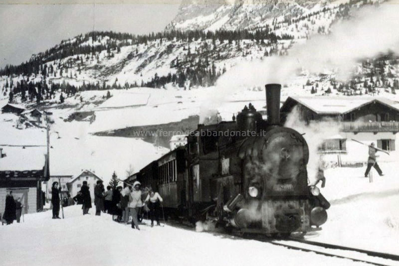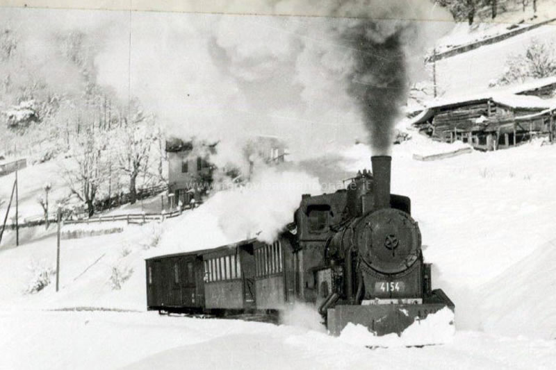 Treno in sosta alla stazione di Selva nell'inverno del 1957 (archivio J. Klein)