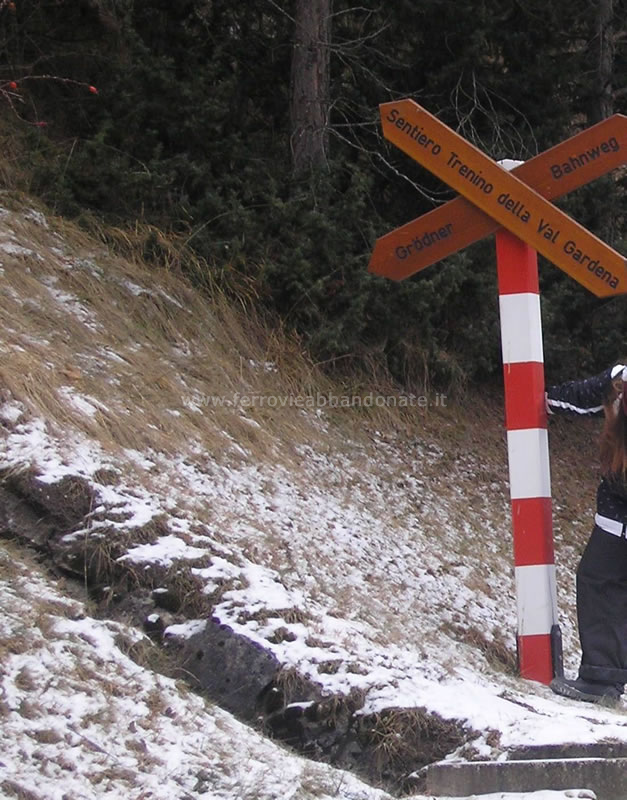 Segnaletica lungo l'ex-sedime, oggi convertito in pista ciclopedonale, nei pressi di Ortisei (F. Toniolo, 2016)