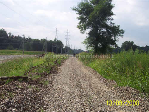 Inizio del tratto di ferrovia abbandonato nei pressi di Cernusco Lombardone, con l'armamento già rimosso. A sinistra, la nuova linea a doppio binario (G. P. Visconti, 2008)
