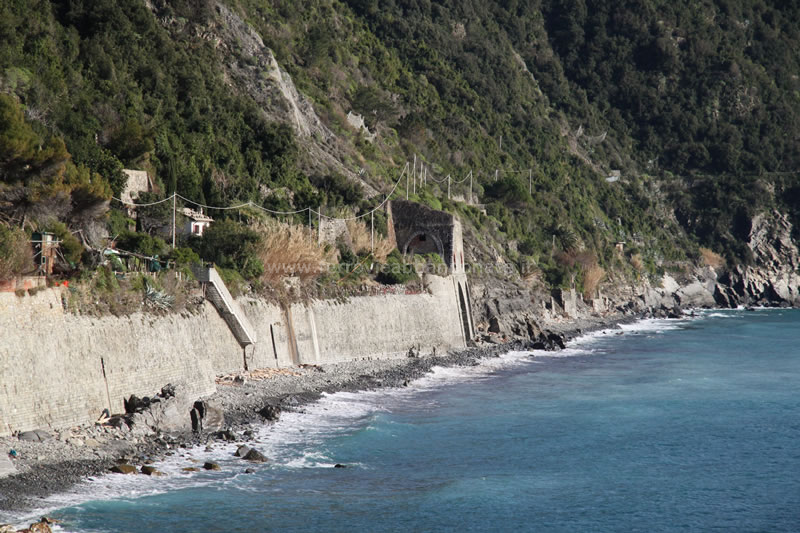 Vecchio sedime, parzialmente franato, di fronte alla galleria Remeggiola-Manarola, tra Corniglia e Manarola (M. Viganò, 2016)