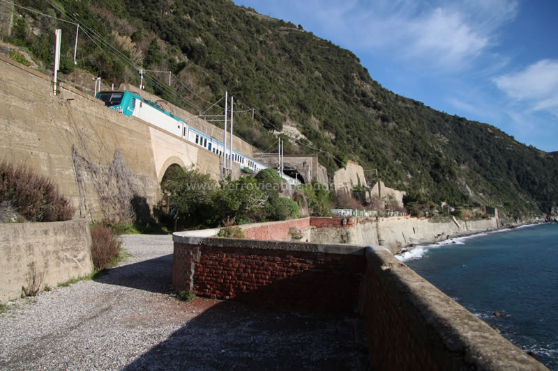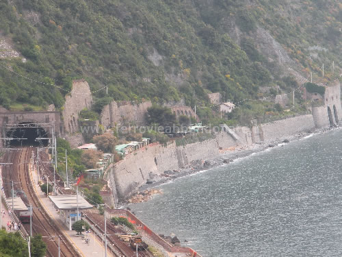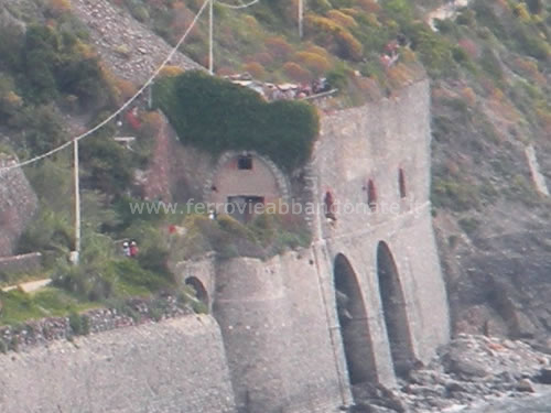 Stazione di Corniglia: a sinistra il tracciato attuale entra in galleria, a destra il sedime abbandonato che seguiva da vicino la costa (E. Botta, 2010)