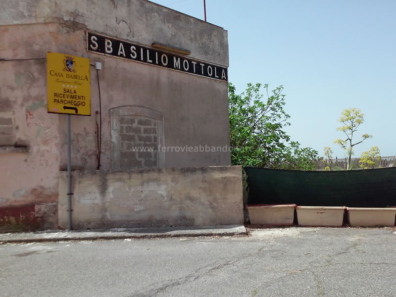 Particolare del fabbricato viaggiatori della stazione di S. Basilio-Mottola, con il nome ancora ben leggibile (M. Ferrante, 2015)