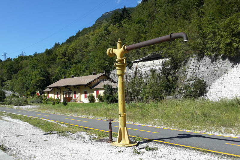 Piazzale della stazione di Chiusaforte, con i marciapiedi e la colonna idrica ancora visibili accanto al percorso ciclopedonale (A. Bruzzone, 2014)