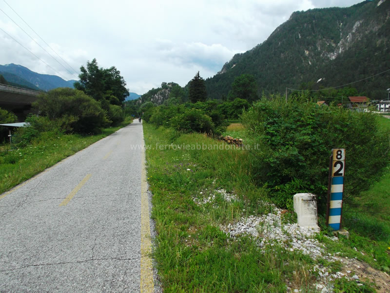 Percorso ciclopedonale realizzato lungo l'ex-sedime a Ugovizza, con il cippo superstite del km 82 (T. Antoniotto, 2019)