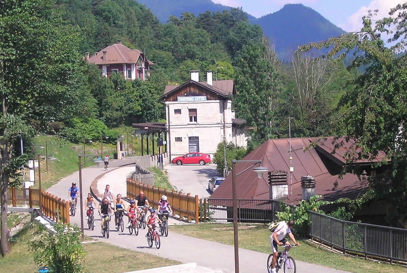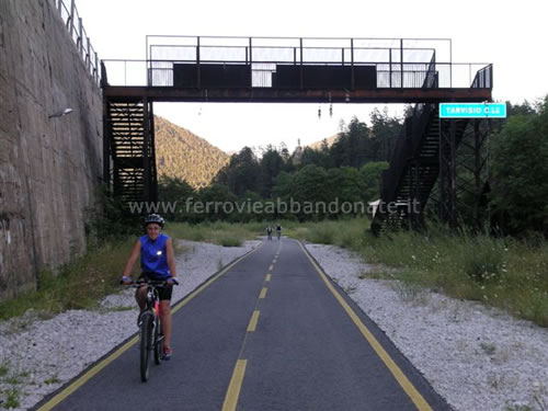 Pista ciclo-pedonale realizzata sull'ex-sedime in corrispondenza della stazione di Chiusaforte (A. Bruzzone, 2014)