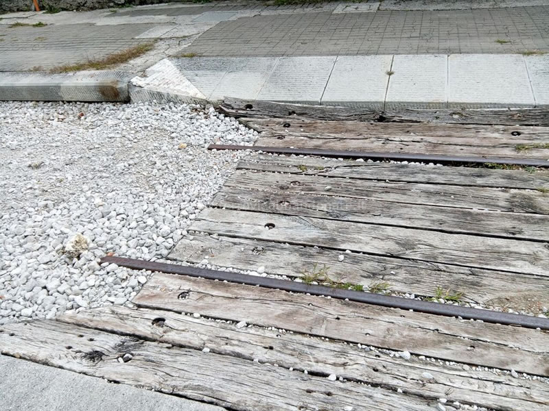 Particolare del marciapiede dei binari 2 e 3 della ex-stazione di Tarvisio Centrale, desolatamente in stato di degrado (O. Malatesta, 2012)