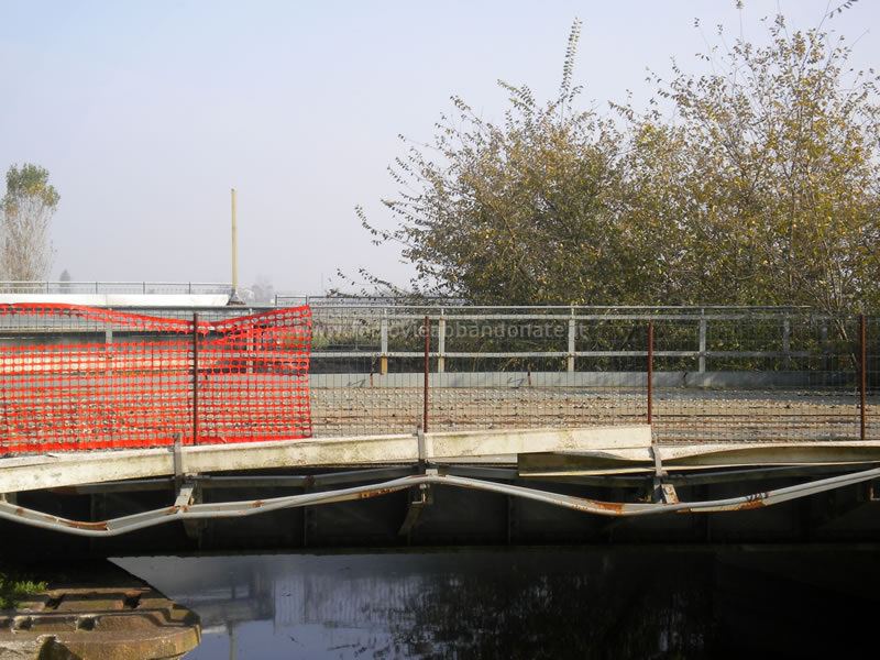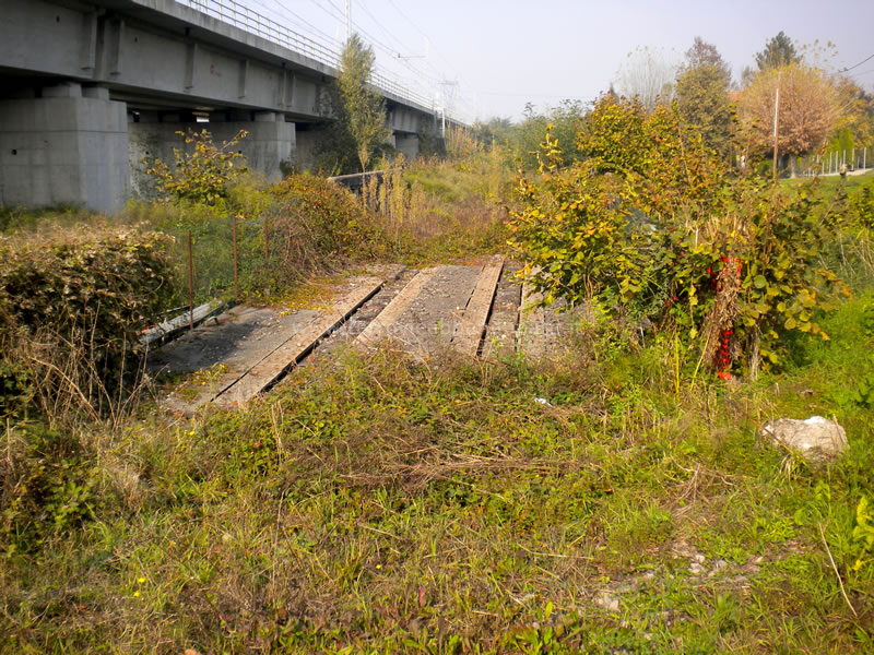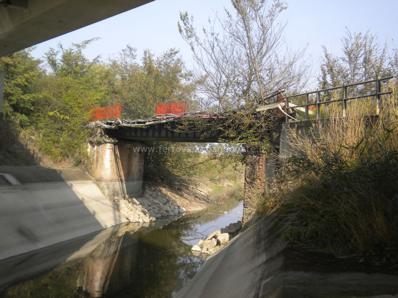 Resti di un ponte su un canale nei pressi dell'ex-passaggio a livello di via Albarese, tra le ex-fermate di Crocetta e Amola. Sulla sinistra il nuovo tracciato (M. Martelli, 2013)