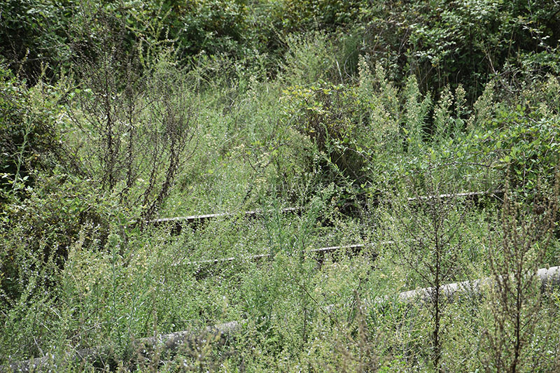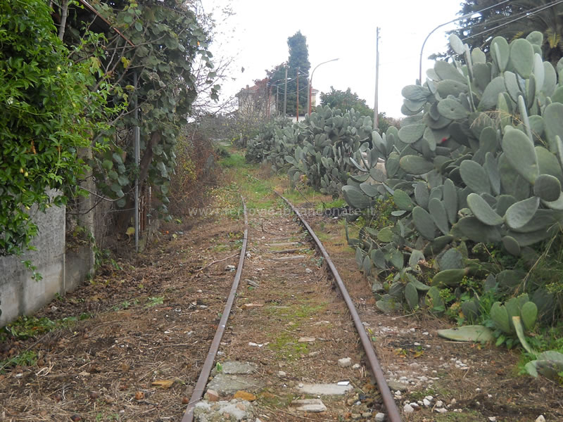 Sede ferroviaria invasa dalla vegetazione in corrispondenza di un ex-passaggio a livello nei pressi della fermata di S. Fantino. (A. Stigliani, 2024)