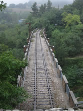 Altra immagine dell'ultimo viadotto prima della stazione di Urbino, con un segnale ad ala superstite lungo il binario (A. Stigliani, 2013)