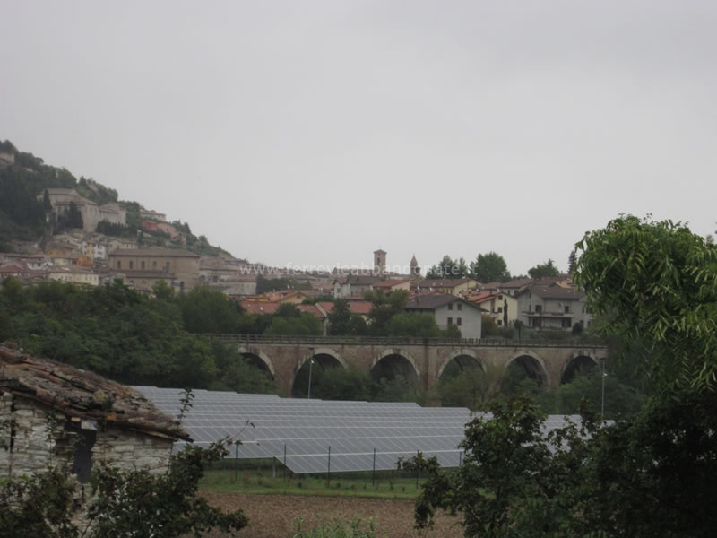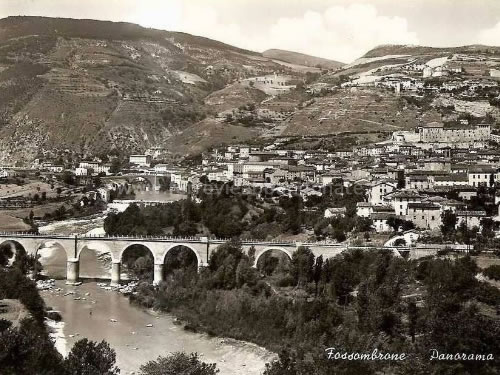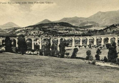 Cartolina d'epoca della cittadina di Fossombrone, con in primo piano il viadotto ferroviario della Fano-Urbino (Fonte: archivio P. A. Marchese)