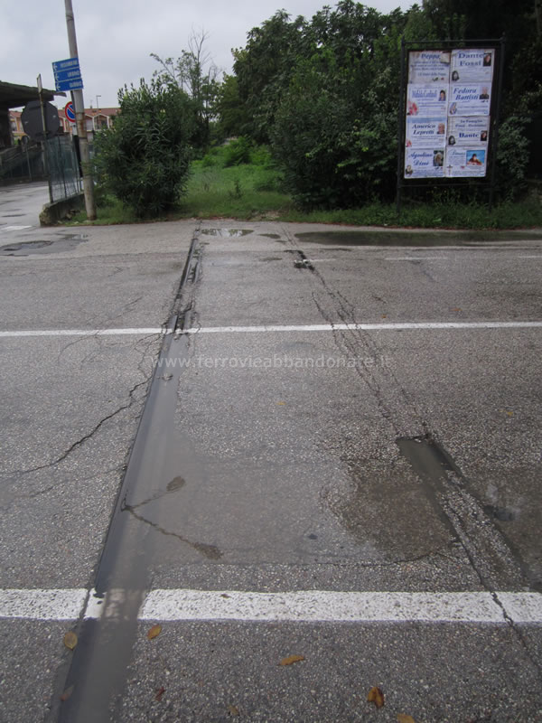 Binario affogato nell'asfalto in corrispondenza di un passaggio a livello nell'abitato di Calcinelli di Saltara (A. Stigliani, 2013)