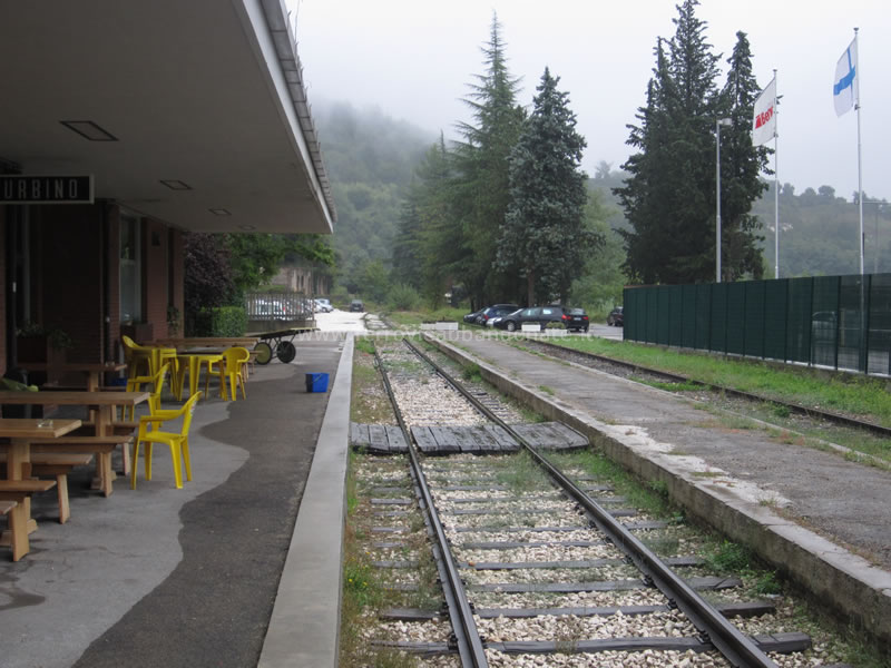 Ex-stazione di Fossombrone, lato binari: il marciapiede del primo binario ospita oggi i tavoli di un bar (A. Stigliani, 2013)