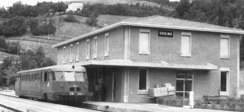 Immagine storica di un'automotrica in sosta alla stazione di Urbino (Fonte: archivio P. A. Marchese)