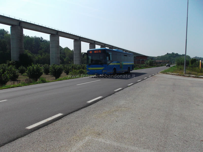 Viadotto Castagnole, tra Costiglione Motta e Castagnole delle Lanze, con in primo piano un autobus sostitutivo della ferrovia (T. Antoniotto, 2014)