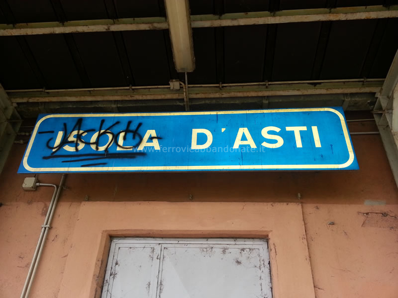 Particolare del cartello indicatore della stazione di Isola d'Asti (T. Antoniotto, 2018)