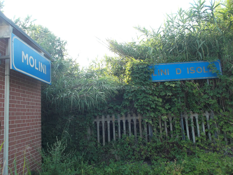 Particolare dei cartelli indicatori della ex-fermata di Molini d'Isola (T. Antoniotto, 2018)