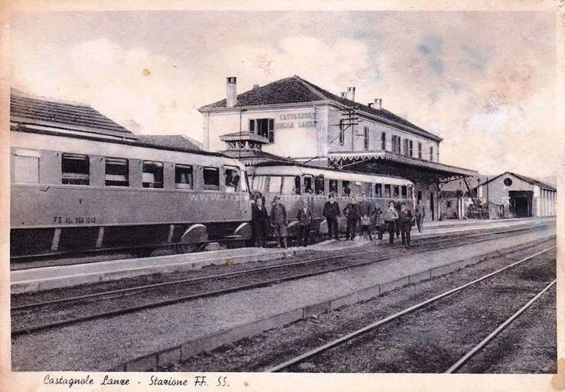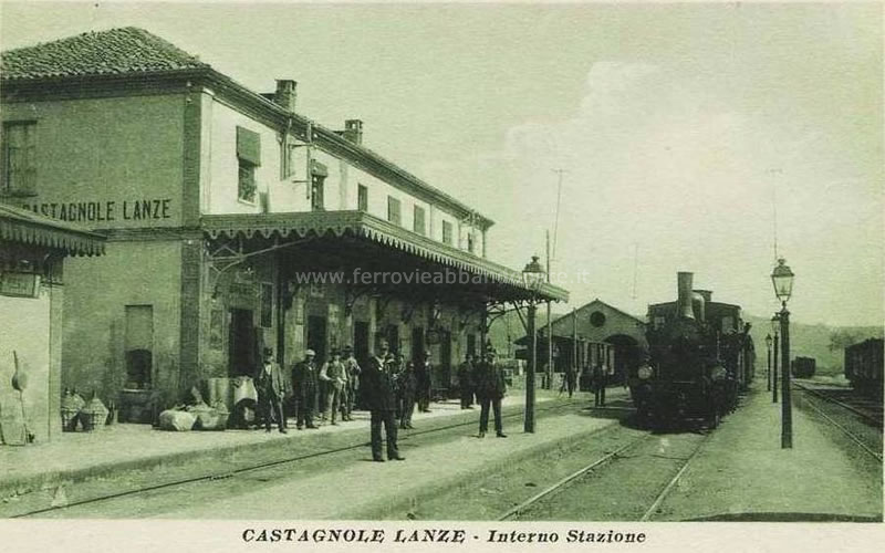Cartolina d'epoca della stazione di Castagnole delle Lanze ai tempi della trazione a vapore (archivio P. A. Marchese)