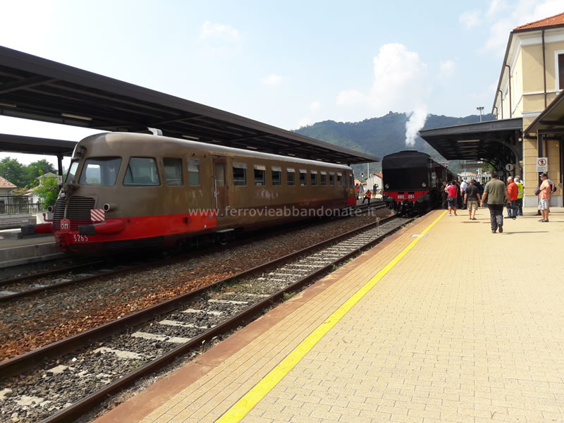Stazione di Romagnano Sesia: incrocio tra rotabili storici (ALn 772.3265 e Gr 880.050) (Damiano, 2016)