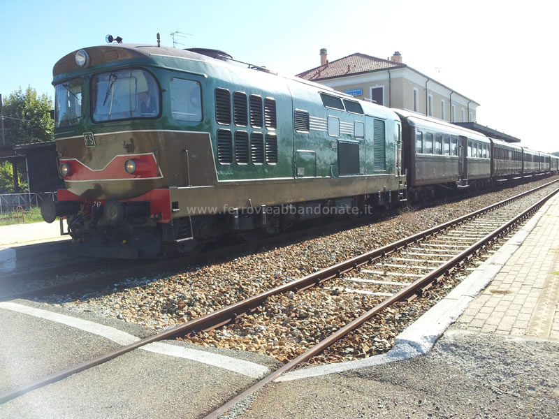 Stazione di Romagnano Sesia, con treno in partenza per Varallo, alcuni mesi prima della sospensione del servizio (Damiano, 2014)